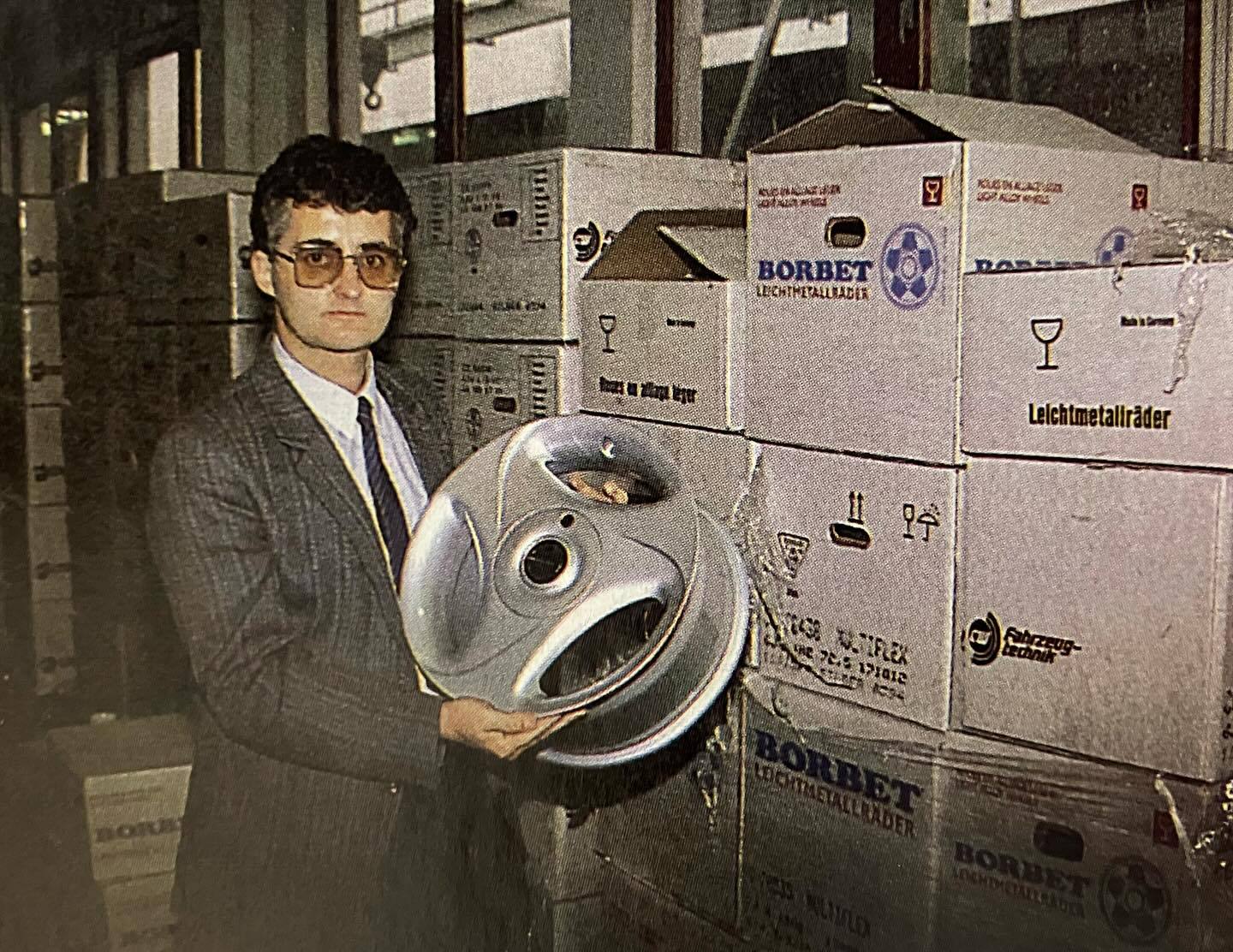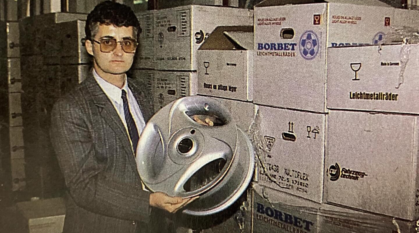 Inženýr Z. Mištěra pózuje s diskem BORBET G, který byl v 1. polovině 90. let naprostou novinkou firmy, jaro 1994.