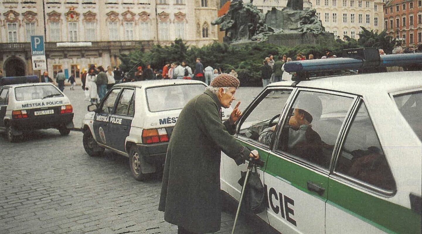 Z cest (90. léta) Diskuze s policií (1994) 26. 6. 202427. 10. 2025 90sCzechRoads 1994 Důchodkyně diskutuje s policií na Staroměstském náměstí v Praze, rok 1994. Zdroj: Svět Motorů 1994, foto: Markéta Lexová
