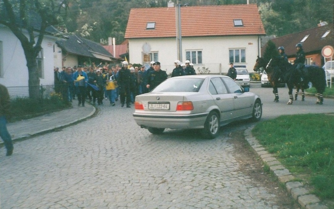BMW E36 míjí fotbalové fanoušky Zlína, náměstí na Cigánově ve Zlíně, rok 2000.