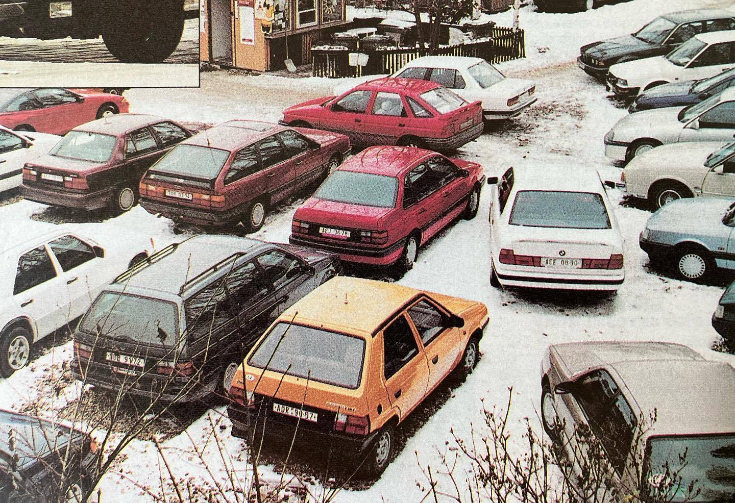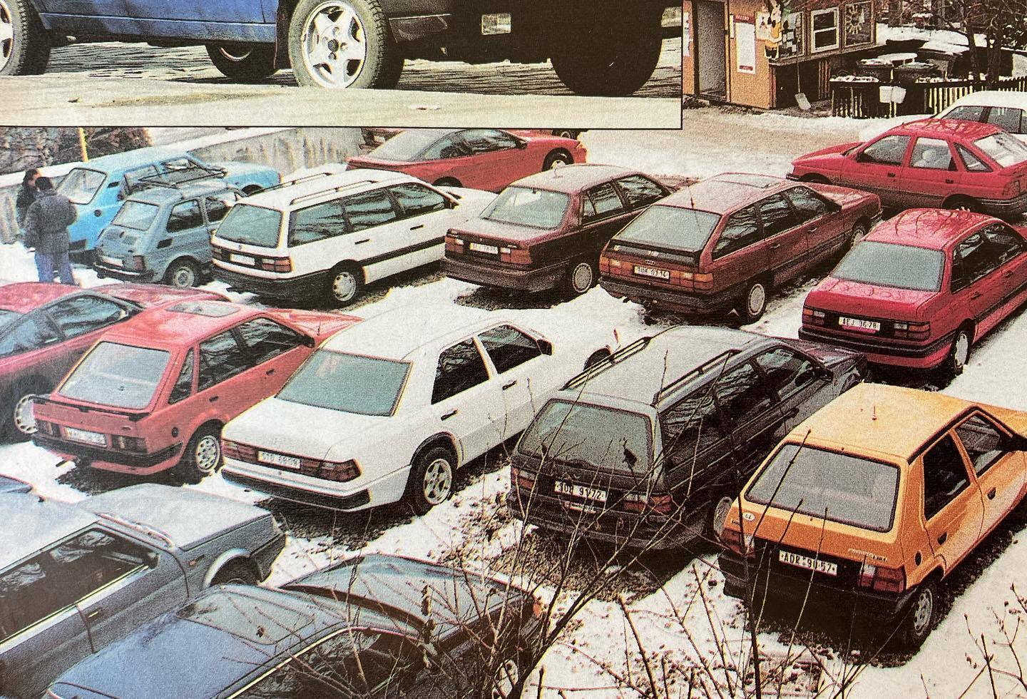 Dobová fotografie českého parkoviště v polovině 90. let.