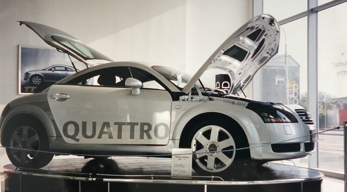Nové AUDI TT (1. generace, typ 8N) na výstavní platformě ostravského dealera Audi, rok 2000.
